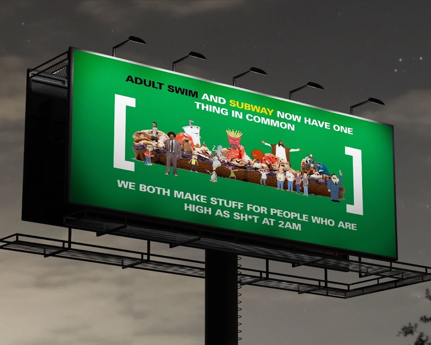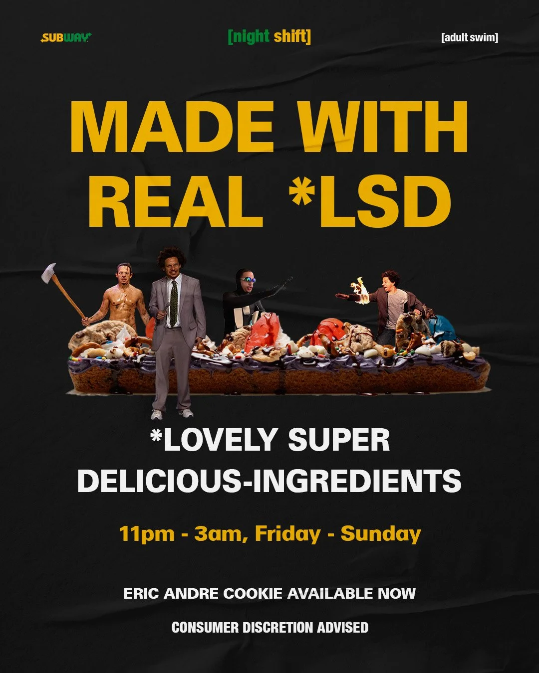 Concept: Collaborate with Adult Swim and some of their biggest shows to bring the weirdness of late night TV to Subway through limited time cookies and collectibles, a social media campaign entrenched in off-the-rails humor, an anime mini-series, and a new store experience to tie it all together.
